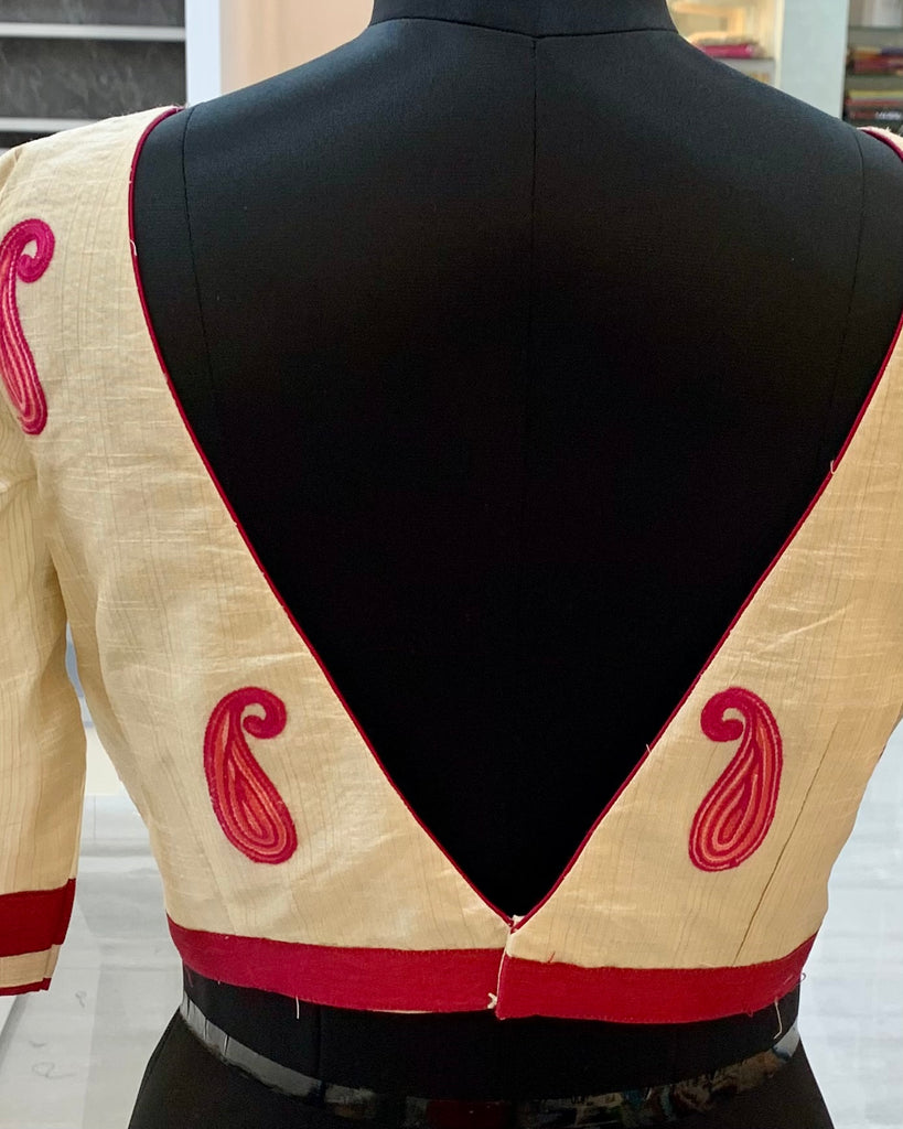 A beautiful viscose dupion padded blouse in beige color with pink kashmiri thread embroidery blouse. The buttons close at the back.